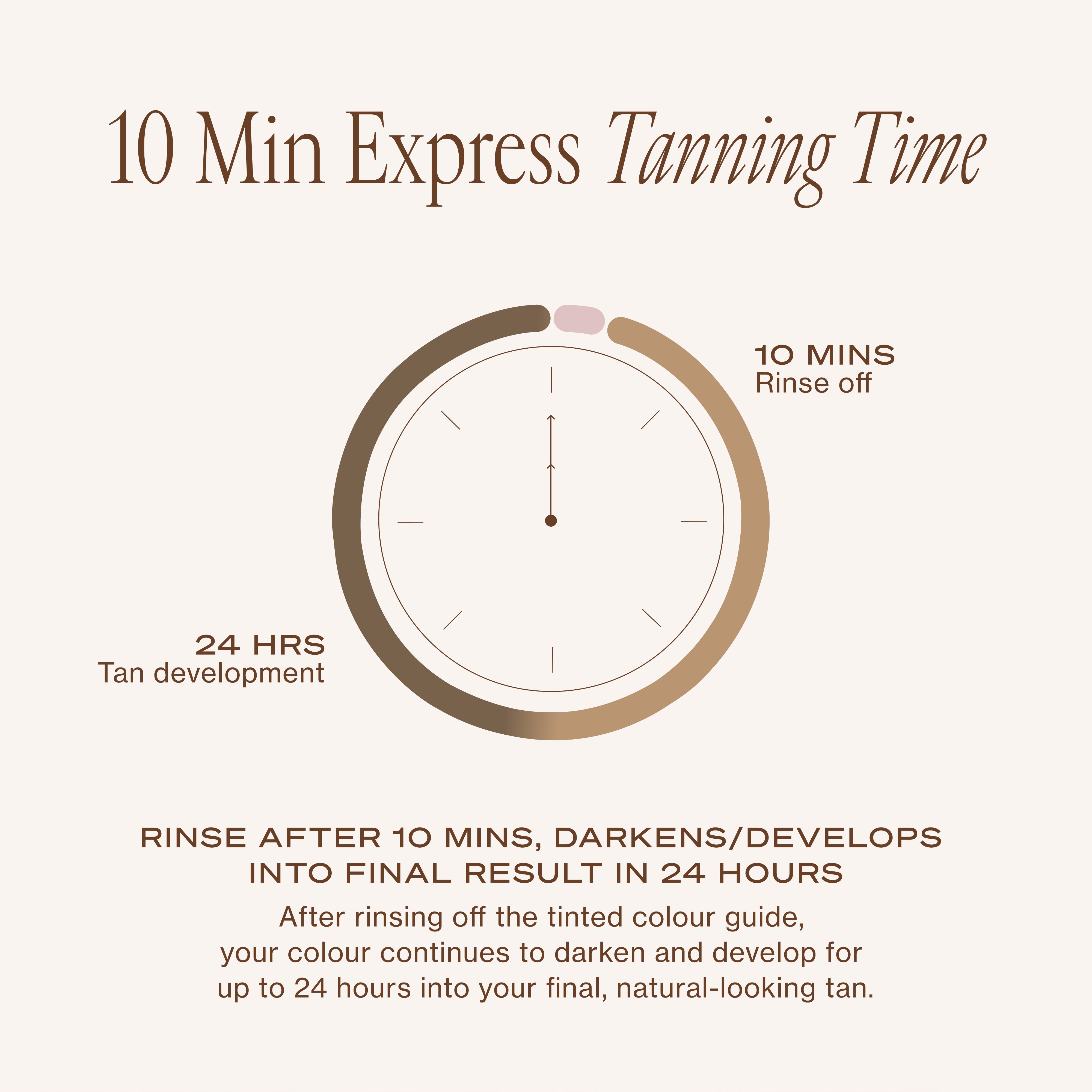 The 10 MIN Express Self-Tanning Smoothing Body Mask is designed to be rinsed off in just 10 minutes. Once the tinted colour guide is rinsed off, you will see visible results from 6 to 8 hours, and your colour will continue darking and developing for up to 24 hours.