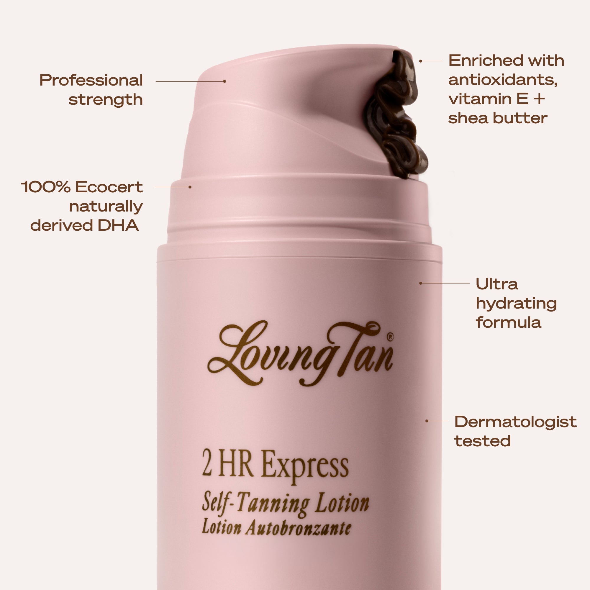 2 HR Express Self-Tanning Lotion creates a natural-looking, streak-free tan with skincare–infused benefits for an ultra-hydrating finish; the colour guide can be rinsed off in 2 hours. Your tan will continue to develop for up to 24 hours into your most natural-looking tan.