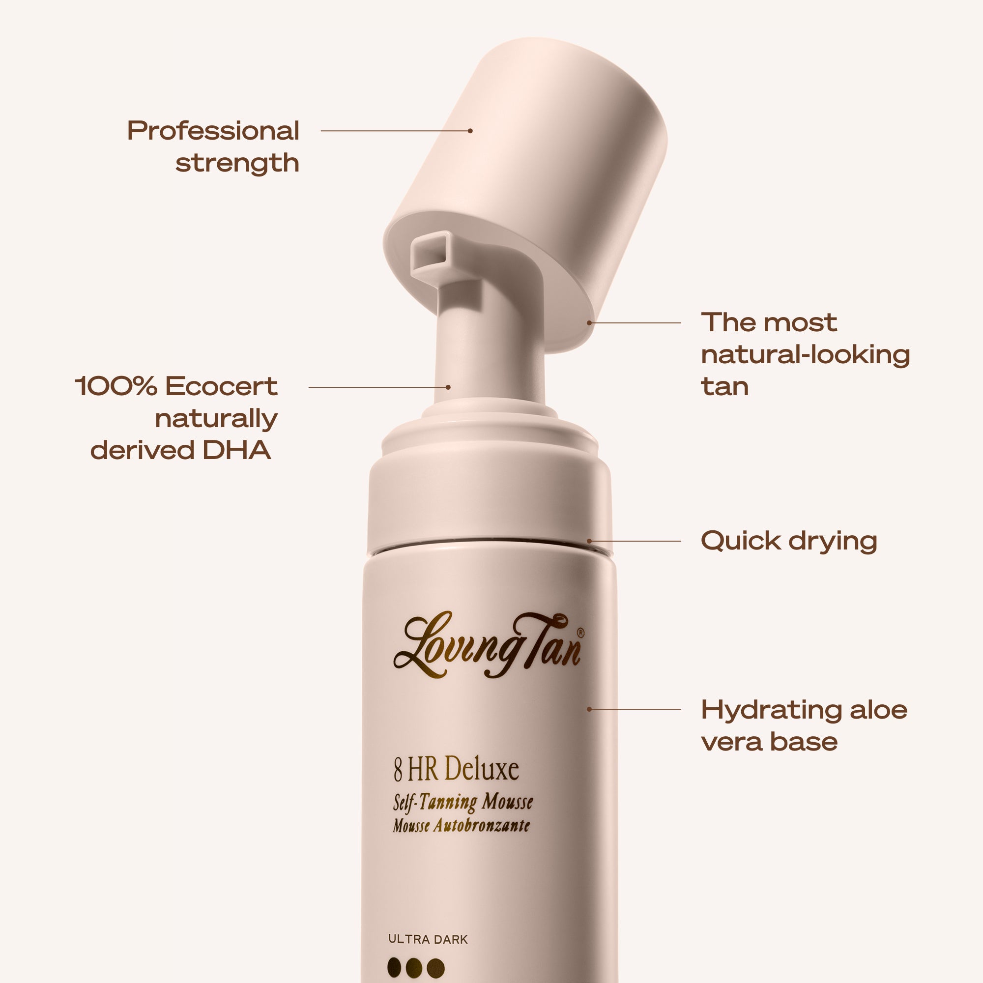 8 HR Deluxe Self-Tanning Mousse creates the most natural-looking, long-lasting, streak-free tan; colour guide can be rinsed off in 8 hours.