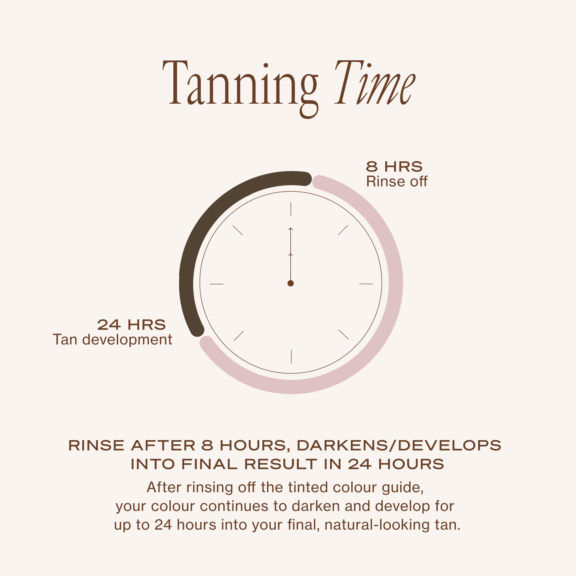 - Rinse colour guide off after 8 hours. Your tan will continue to develop for up to 24 hours.